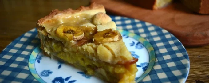 - Βουτυρώστε μια φόρμα ψησίματος με βούτυρο και στρώστε τον πάτο της με λαδόκολλα. Τοποθετήστε τη μισή ζύμη στη φόρμα και ισιώστε την, στη συνέχεια τοποθετήστε τις μπανάνες και καλύψτε με την υπόλοιπη ζύμη.